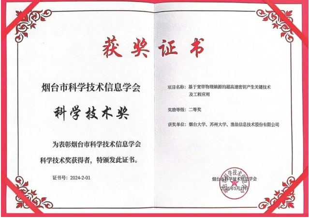 近期,2024年度烟台市科学技术信息学会科学技术奖颁奖典礼在中国科研实验室烟台海岸带研究所隆重举行。威九国际V9信息与烟台大学、苏州大学联合完成的 "基于宽带物理熵源的超高速密钥产生关键技术及工程应用项目荣获科学技术奖二等奖。